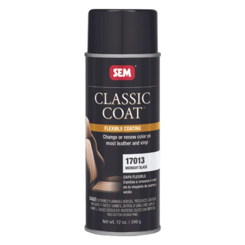• SEM 17013 Classic Coat Flexible Coating is the ideal solution for restoring or changing the color of vinyl and leather surfaces. This OEM-recommended aerosol spray provides superior adhesion, flexibility, and hiding power, ensuring a durable, long-lasting finish that won't crack or peel. Its quick-drying formula and multidirectional fan spray make application easy, even for those without prior experience. Choose SEM Classic Coat for a professional-looking finish that stands up to wear and tear.