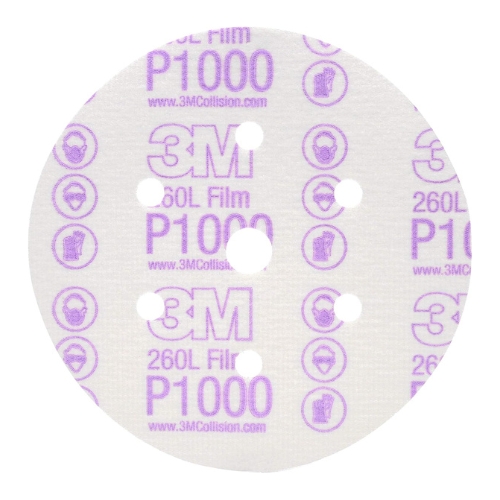 - 3M 01069 Hookit Finishing Film Abrasive Disc 260L is a 6 in, dust free P1000 film-backed disc for dual action sanders. It enables clear coat blending and fine paint prep using aluminum oxide grain, closed coat construction, and durable 3 mil polyester film with Hookit attachment. Designed for 6 in Hookit vacuum pads with a 7 hole pattern.