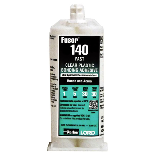 - Fusor 140 Clear Plastic Bonding Adhesive is a two-component urethane structural adhesive for automotive plastic repair; it cures clear and reaches sand/paint readiness in about 30 minutes per the technical data sheet.