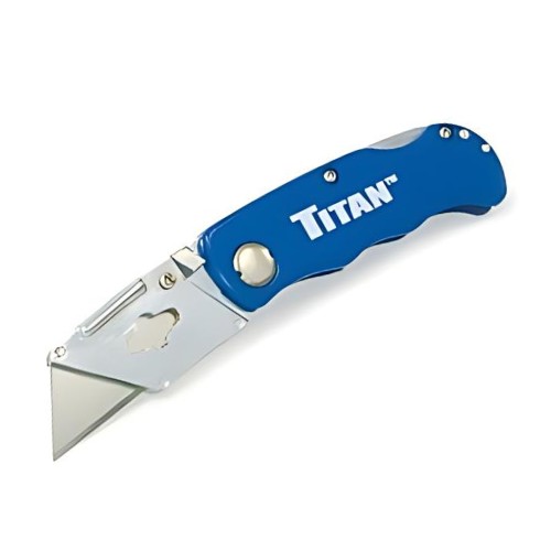 - The Titan 11018 Folding Pocket Utility Knife is a versatile tool designed for convenient cutting tasks. Featuring a quick-change blade mechanism, this utility knife allows for easy and tool-free blade replacements. The folding design ensures safe storage and portability, while the blue handle adds a sleek aesthetic. The knife comes with a belt clip for easy carrying and includes 5 extra blades in a handy dispenser.