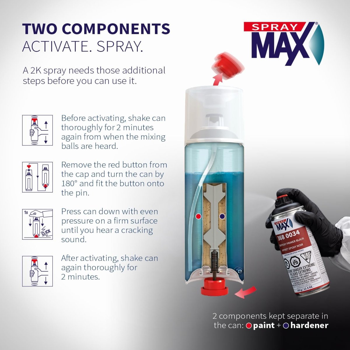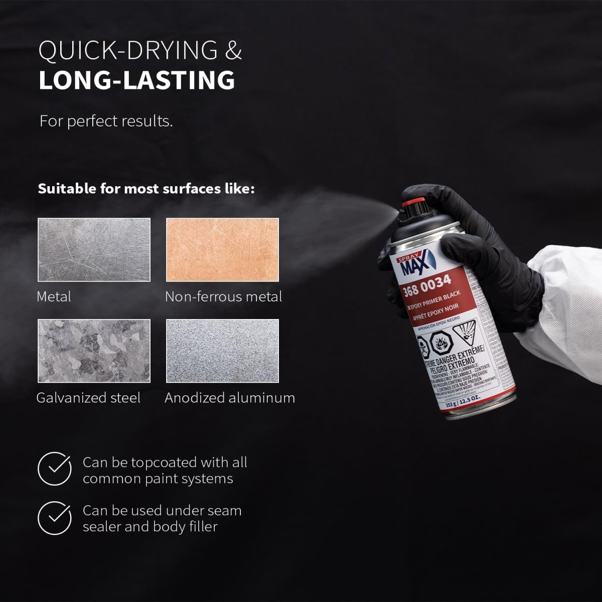 - The SprayMax 3680034 2K Epoxy Primer Aerosol is a professional two-component black epoxy primer designed for excellent adhesion and corrosion protection on bare metal, galvanized steel, aluminum, and pre-painted surfaces. It provides a durable foundation for automotive refinishing, metal repair, and restoration work.