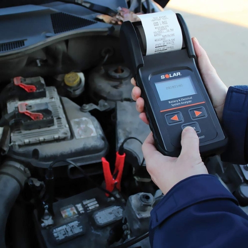 • The Solar BA227 is a 12-volt battery and system tester with integrated thermal printer, designed to evaluate battery health and charging/starting system performance in a single handheld unit.
