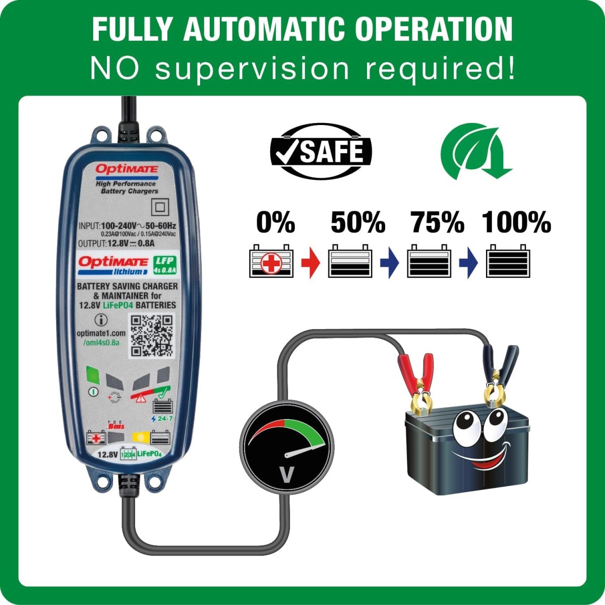 - TecMate TM-471 OptiMate Lithium 4s 0.8A is a smart charger and maintainer for 12.8V and 13.2V LiFePO4 batteries. It runs an automatic 8 step program, supports low volt save, and is weatherproof for indoor or outdoor use, making it ideal for powersport and automotive lithium applications.