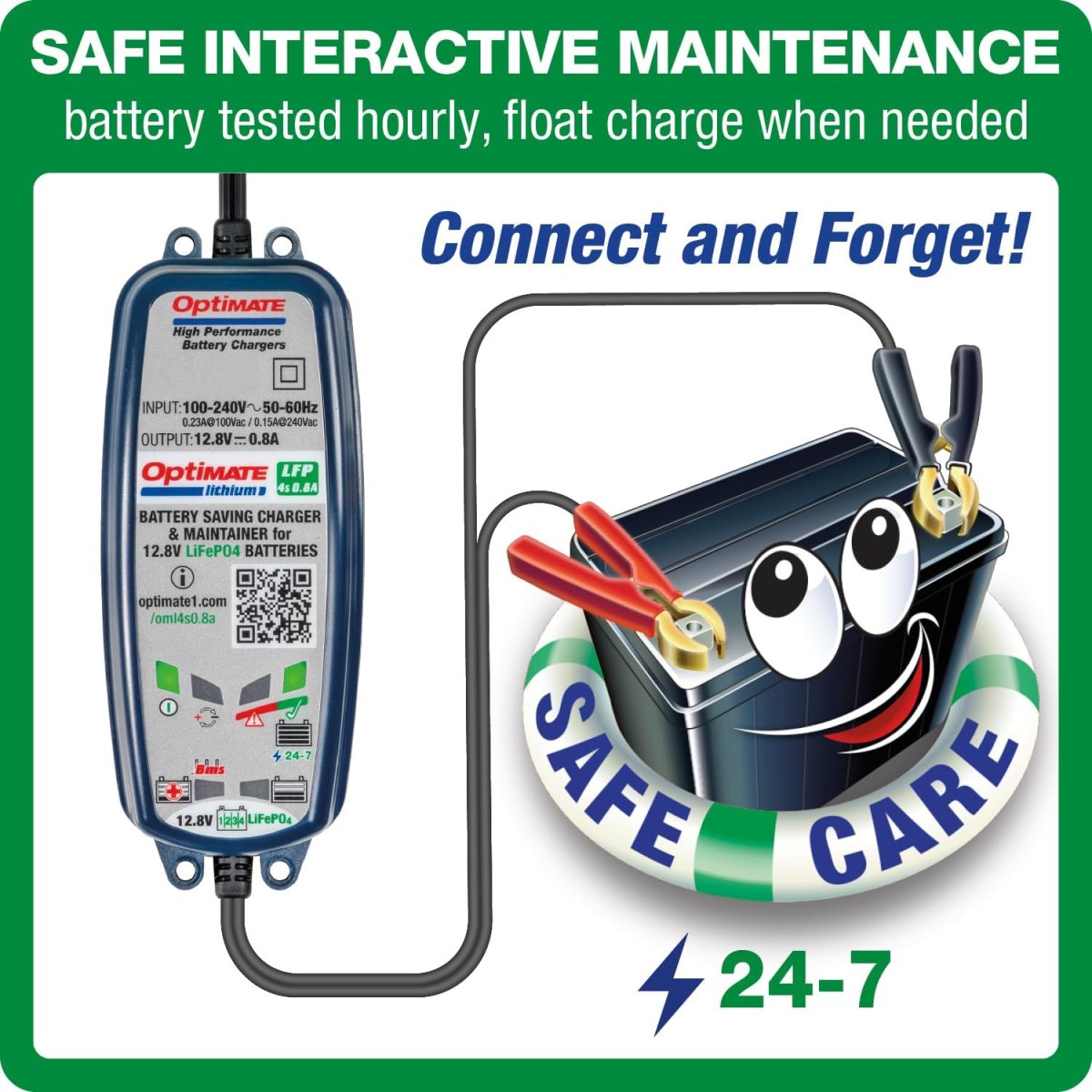 - The OptiMate Lithium 4s 0.8A can also be referred to as lithium battery charger maintainer, LiFePO4 12.8V charger, 0.8 A lithium charger, motorcycle battery maintainer, and powersport lithium charger.
