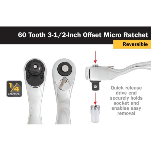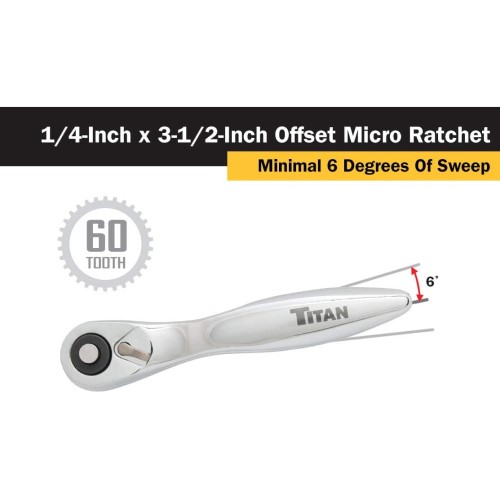• The Titan 11204 1/4" Drive Offset Micro Ratchet can also be referred to as a compact micro ratchet, offset micro ratchet, Titan micro ratchet, and 60-tooth ratchet.