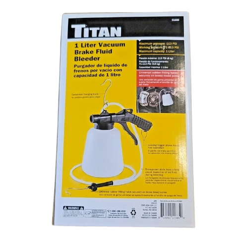 • The Titan 51885 Brake Fluid Bleeder can also be referred to as brake bleeder vacuum pump, pneumatic brake bleeder, one-person brake bleeder, vacuum brake bleeder kit, and brake fluid extractor tool.