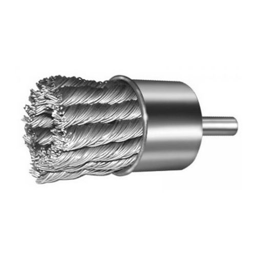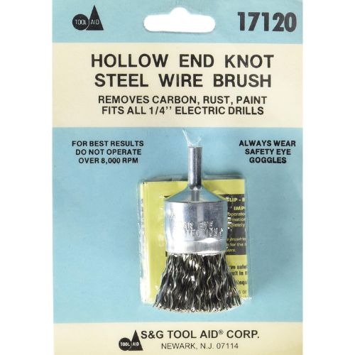 • The Tool Aid 17120 Hollow End Knot End Brush is a heavy-duty wire brush designed for demanding cleaning tasks. Its crimped steel wire construction and high-fatigue resistant 0.020" steel wire make it ideal for removing deep rust, weld splatter, scale, and heavy carbon deposits. The 1-inch diameter brush head offers a wide cleaning area, while the 1/4-inch shank fits all portable drills. For optimal performance and longevity, operate the brush below 8,000 RPM.