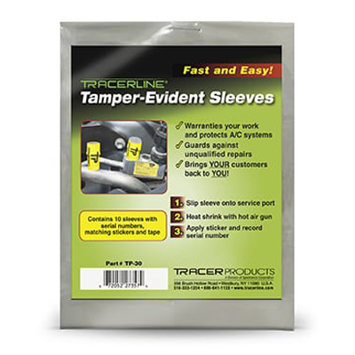 - With different refrigerants available for today's automotive A/C systems, the risk of cross-contamination has become a major concern. Tracerline Tamper-Evident Straps and Sleeves are specifically designed to address this problem. These easy-to-use, cost-effective products ensure the purity of vehicle A/C systems, while protecting the integrity of your service equipment! Features: TP-30 Tamper Evident sleeves come in a convenient storage bag complete with 10 sleeves with serial numbers, matching stickers and tape. Warranties your work and protects A/C systems. Guards against unqualified repairs. Reduces comebacks. Safeguards your recovery equipment.